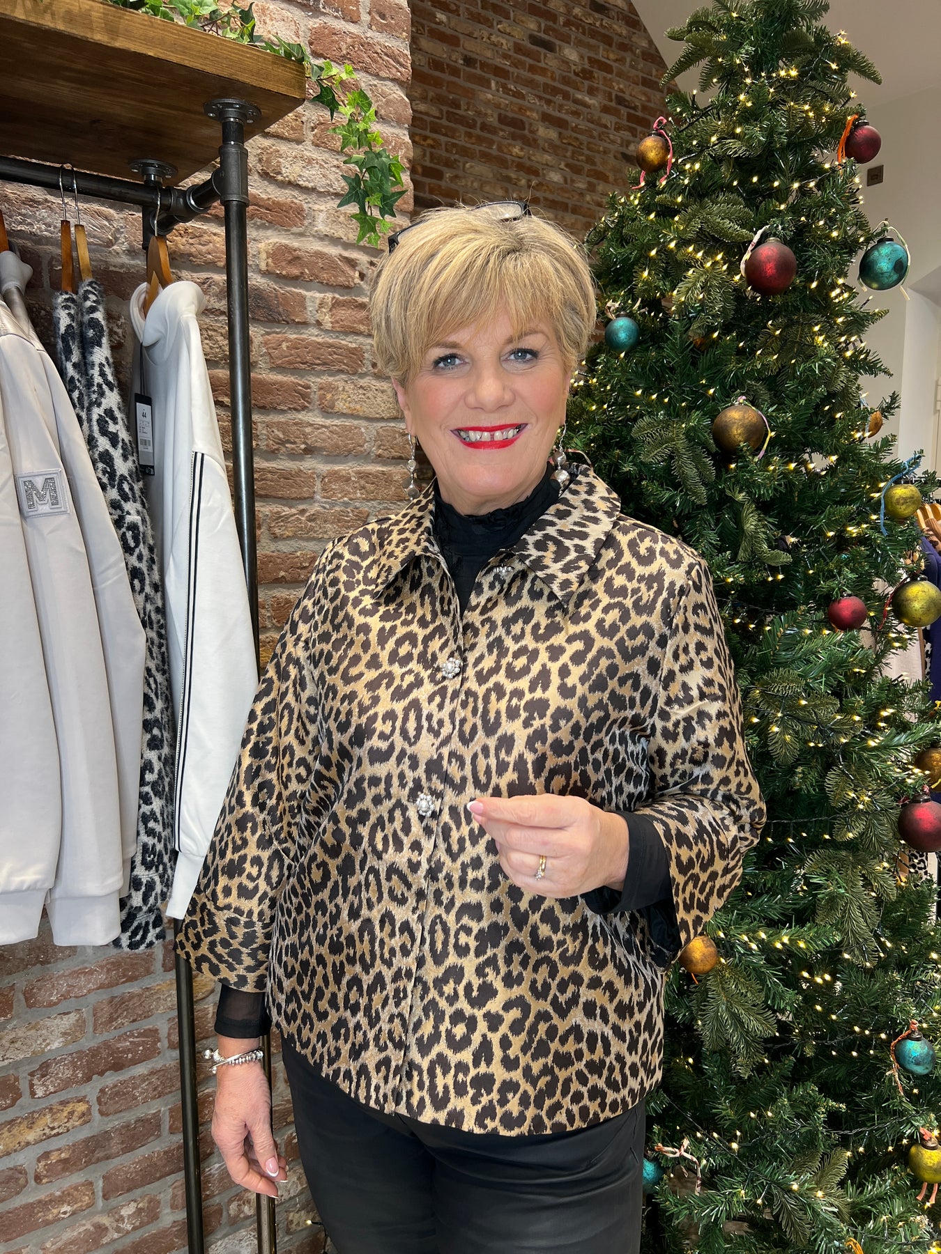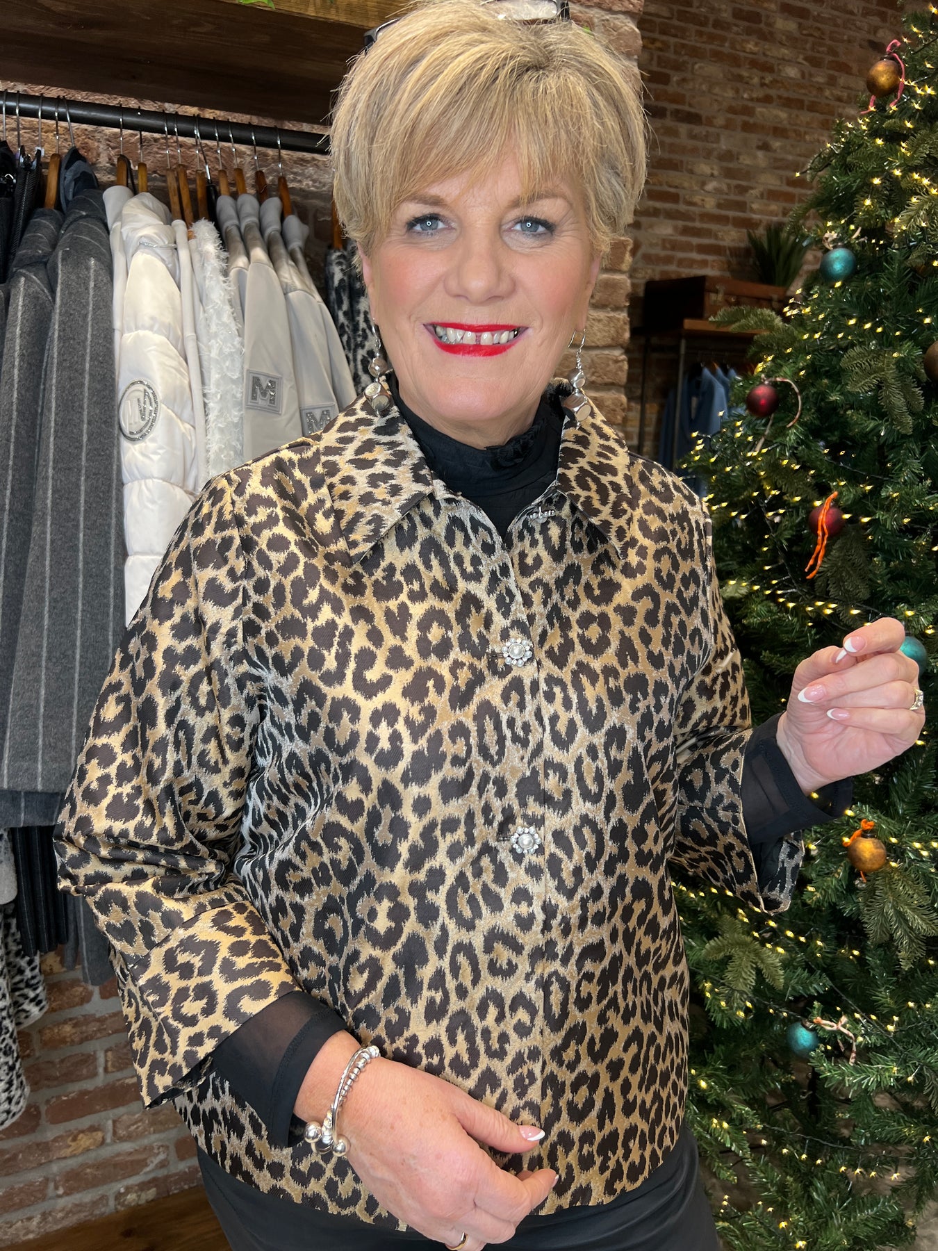 Leopard print, Peter Pan collar, sparkle floral buttoned detail.
