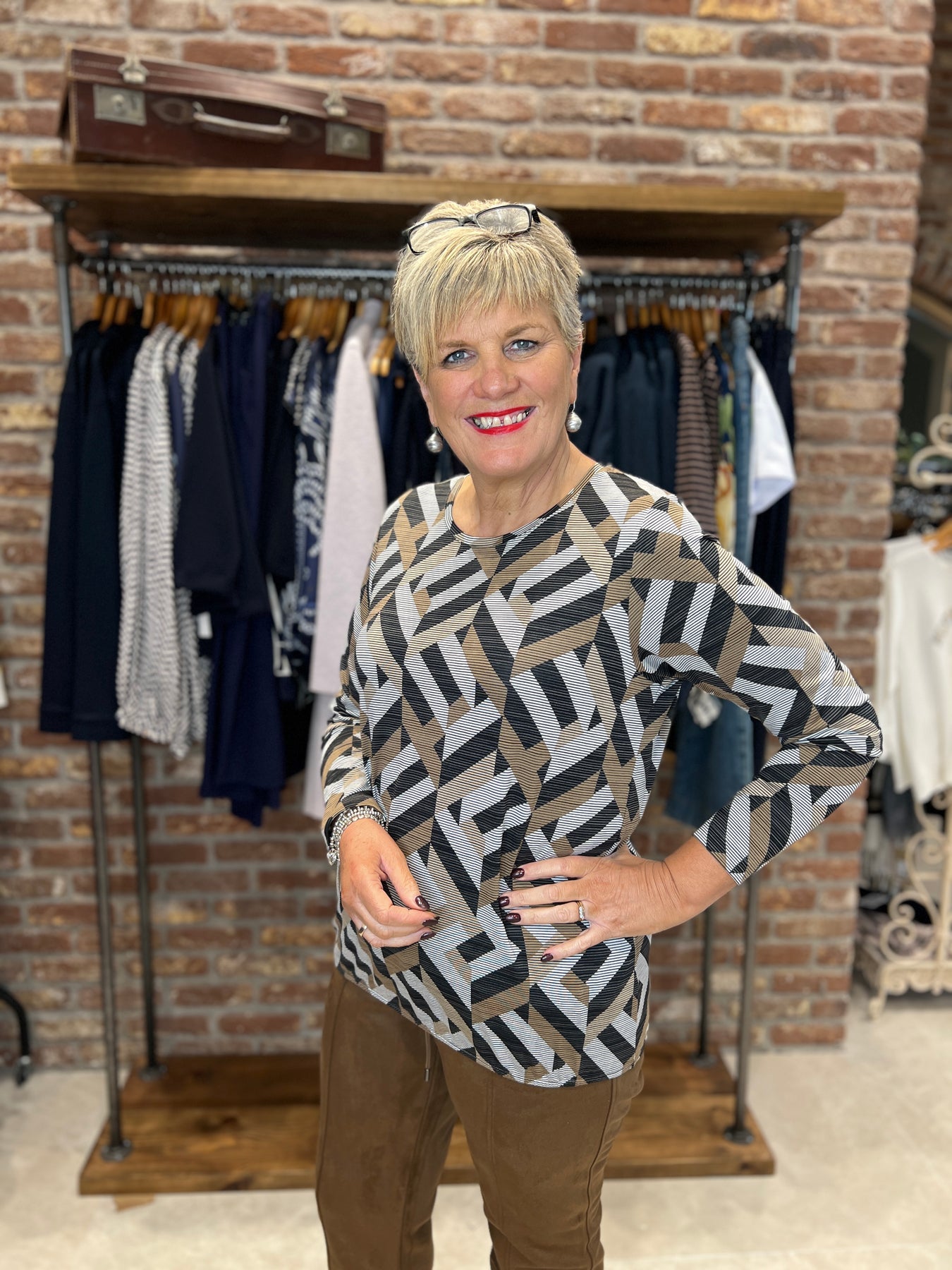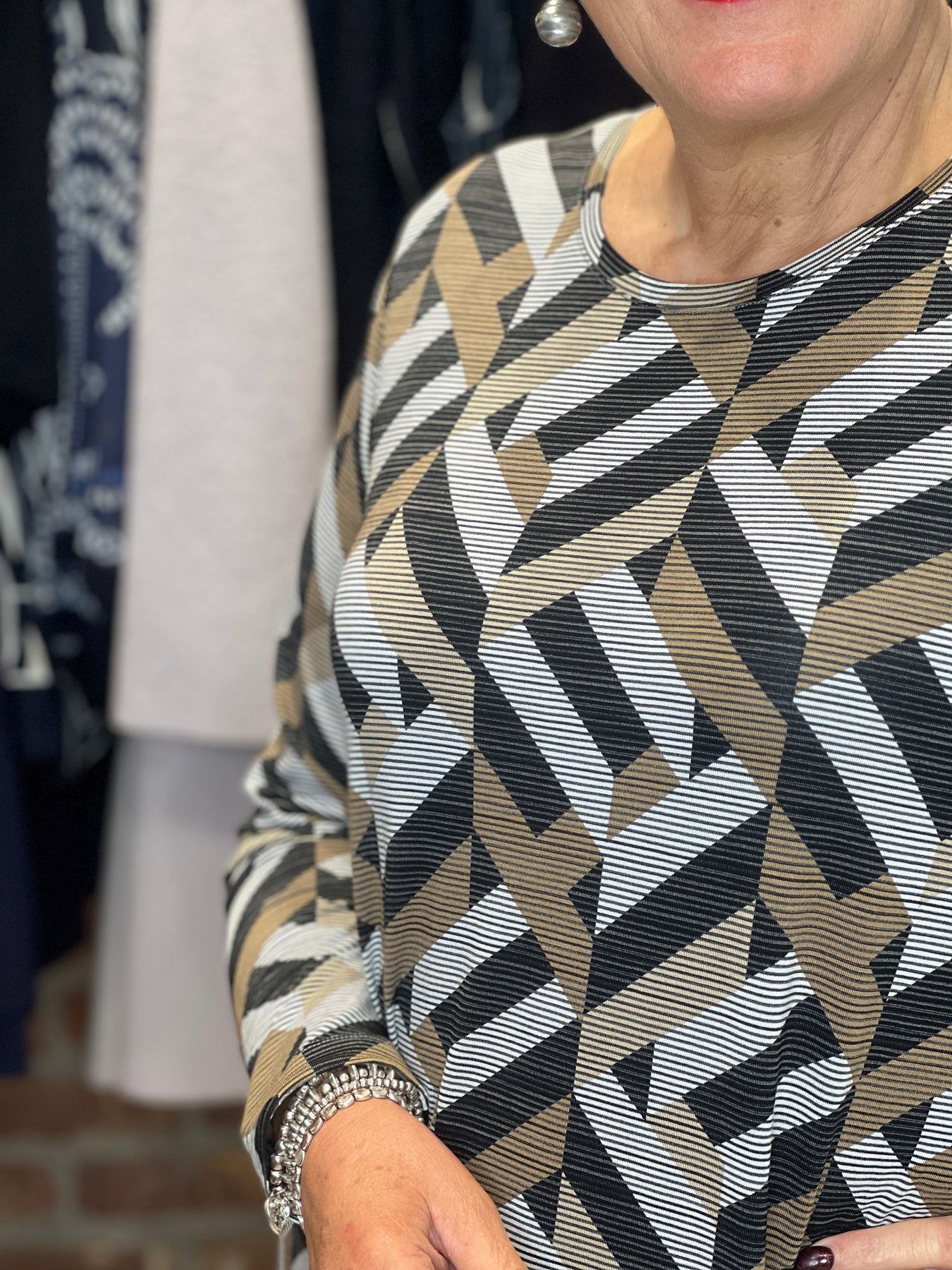 SC-GALINA 64 Blouse is crafted from 52% Viscose, 44% Polyester, and 4% Elastane. It features a geometric print, a round neckline, and long sleeves. Pair it with tailored trousers or a sleek skirt for an elegant look.
