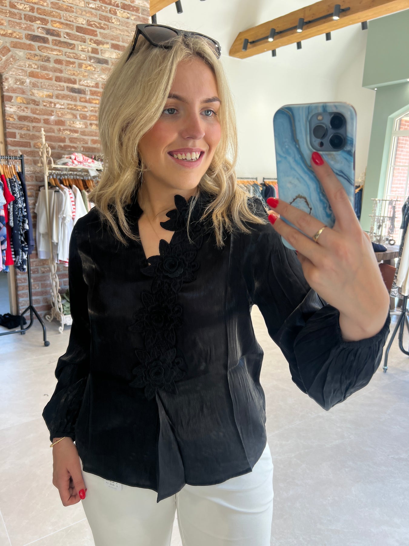 • Features: long sleeves, ruched detail at sleeves, floral detail at neckline, v-neck.