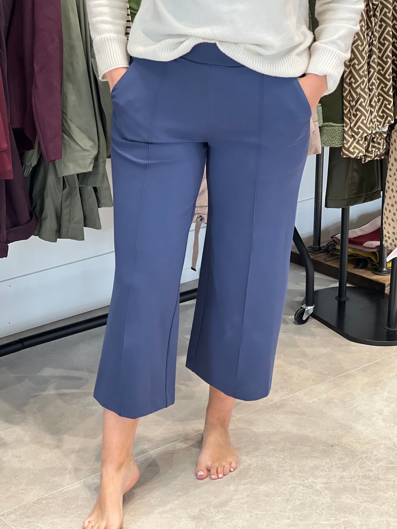 • Features: Are you looking for stylish trousers that fit like a dream? Then these soft trousers in heavy jersey are a good bet. The trousers fit close to the body at the top, while the legs offer extra width and a lovely cropped length. It's also designed with slit pockets, stitched creases and strategic pleats at the back for a great fit. Whether you style it with a top, shirt or knitwear, you'll get an effortlessly stylish look.