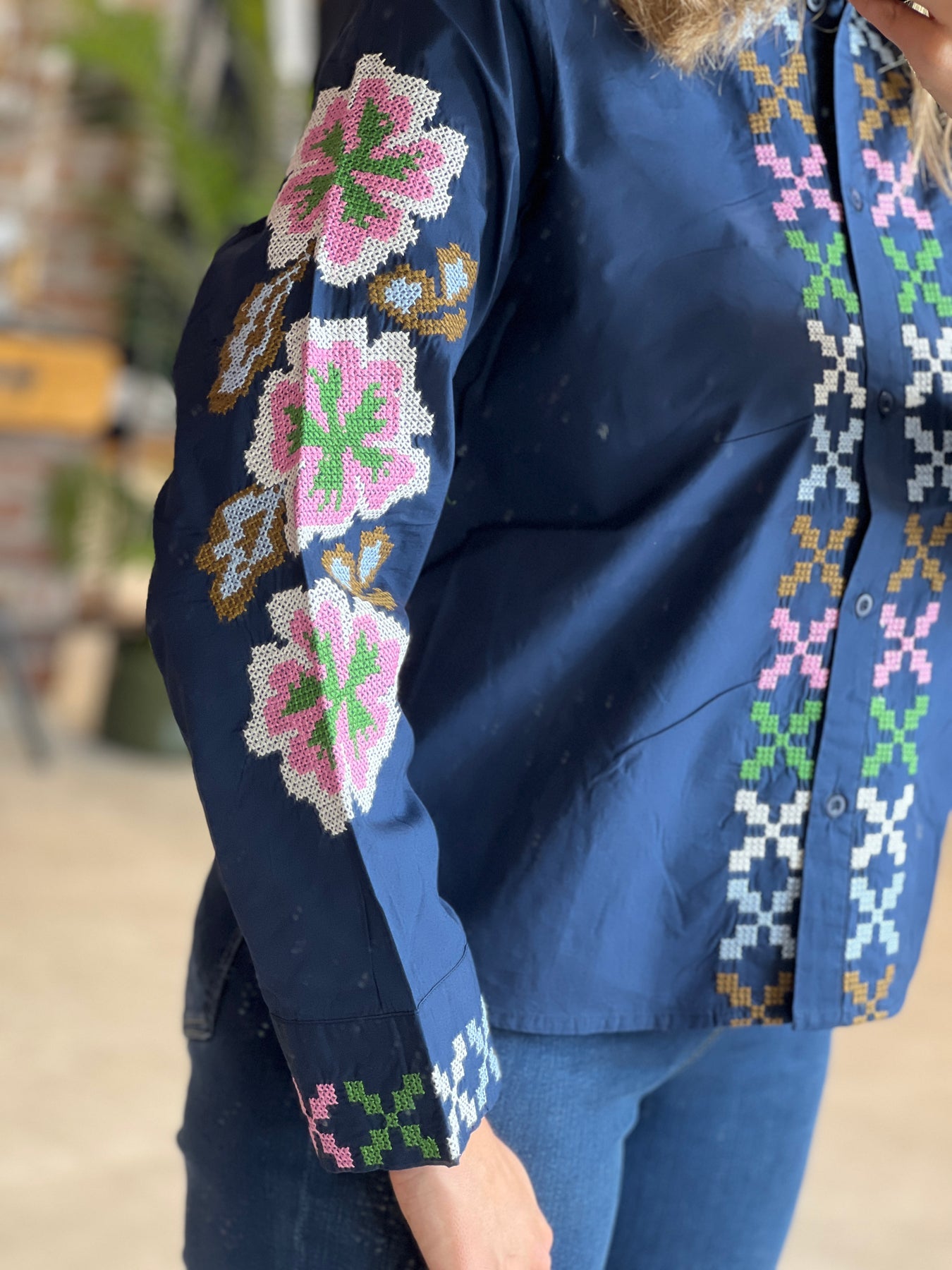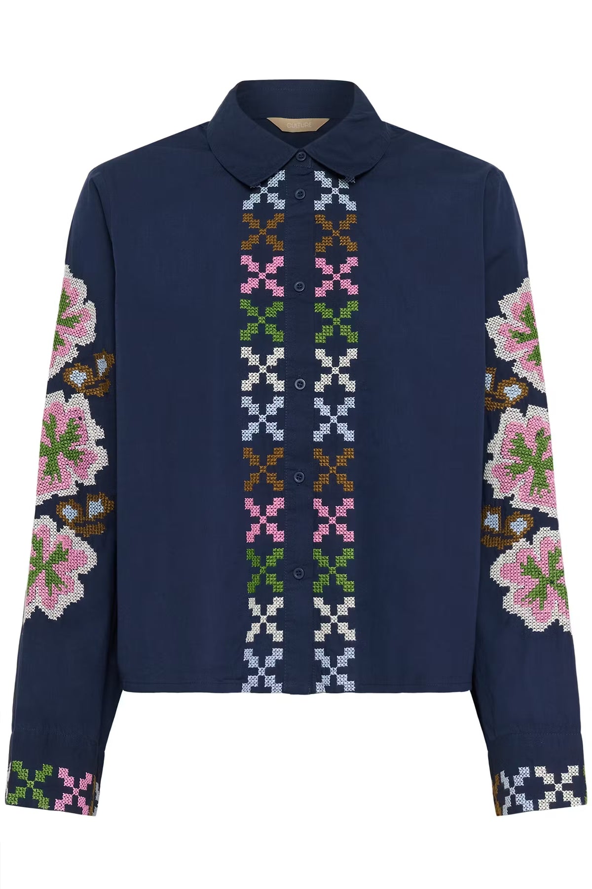 • Features: This blouse features a classic collar, long sleeves, and elegant cross-stitch inspired embroidery. Ideal for versatile styling, the straight-cut silhouette offers all-day comfort and modern appeal for any occasion.