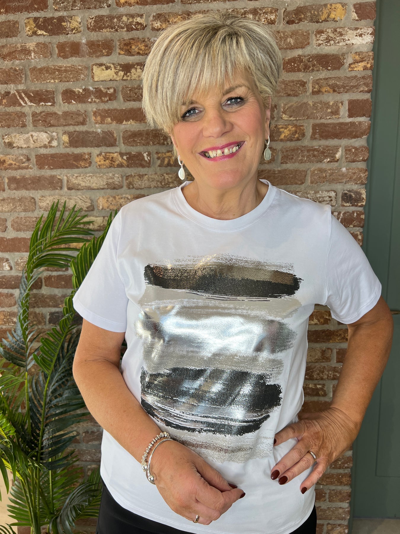 white t-shirt with brush stroke design.