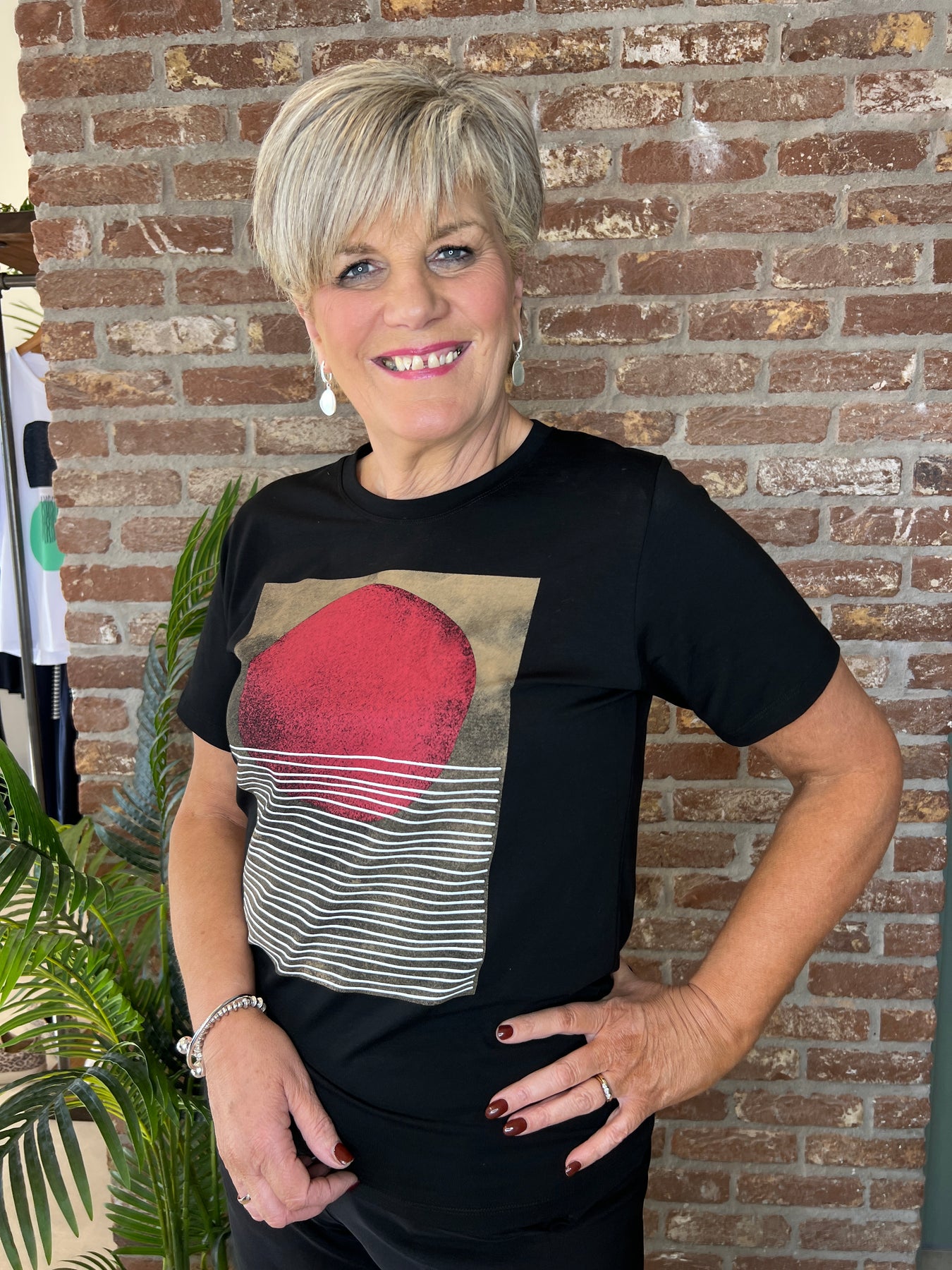 Printed t-shirt in black, white, stone & red