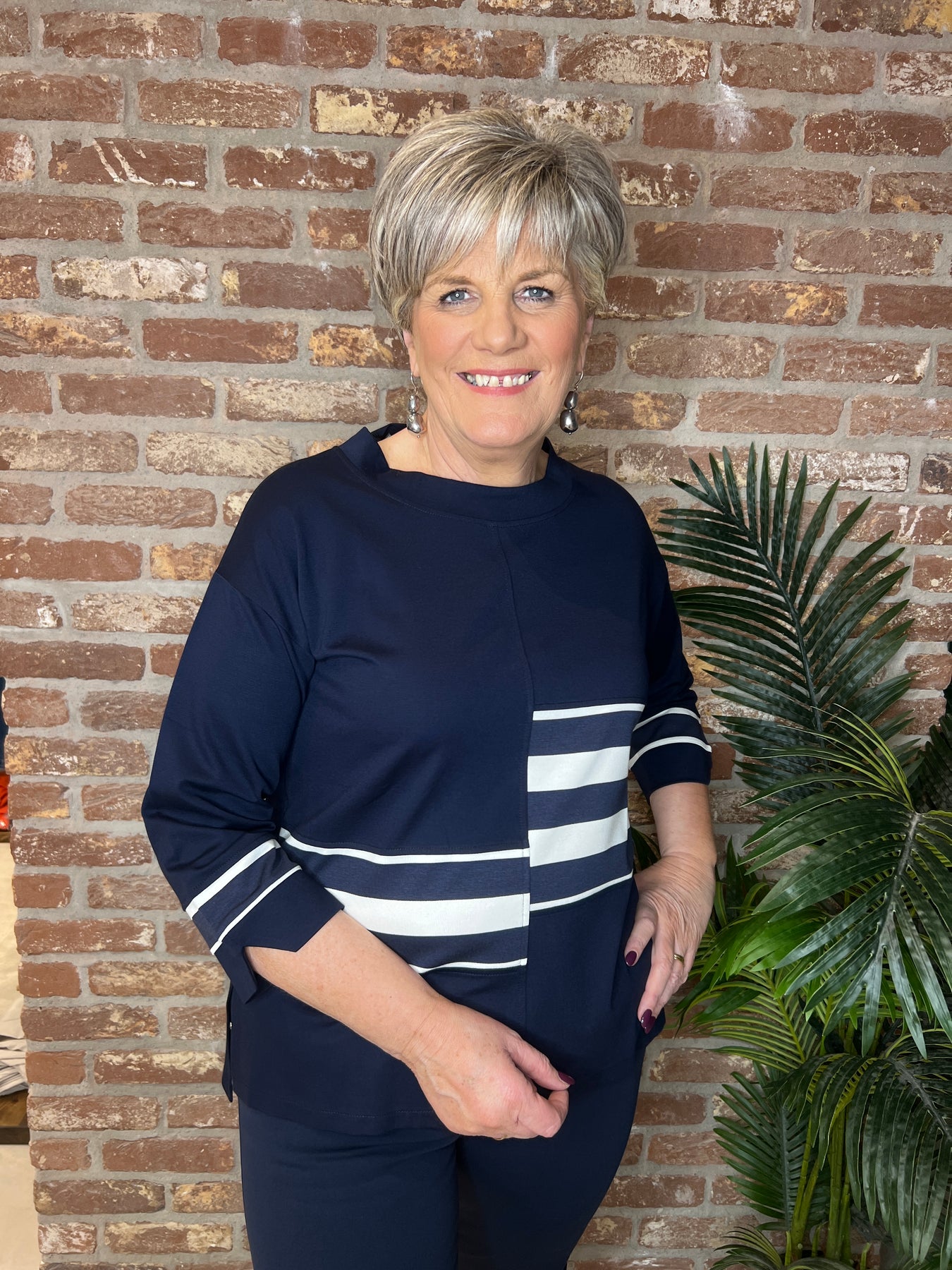 navy striped top, 3/4 length sleeves, detail on sleeves.