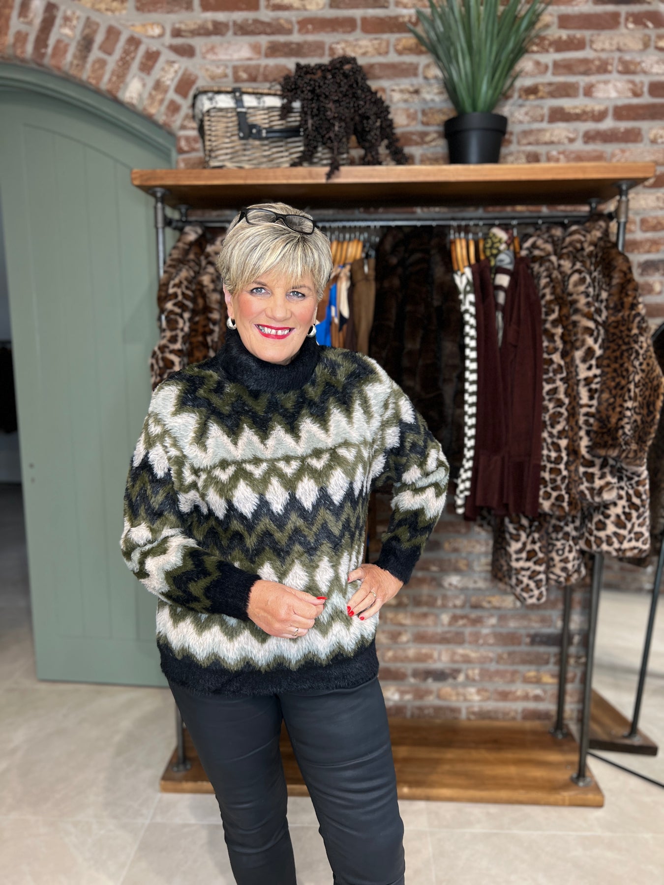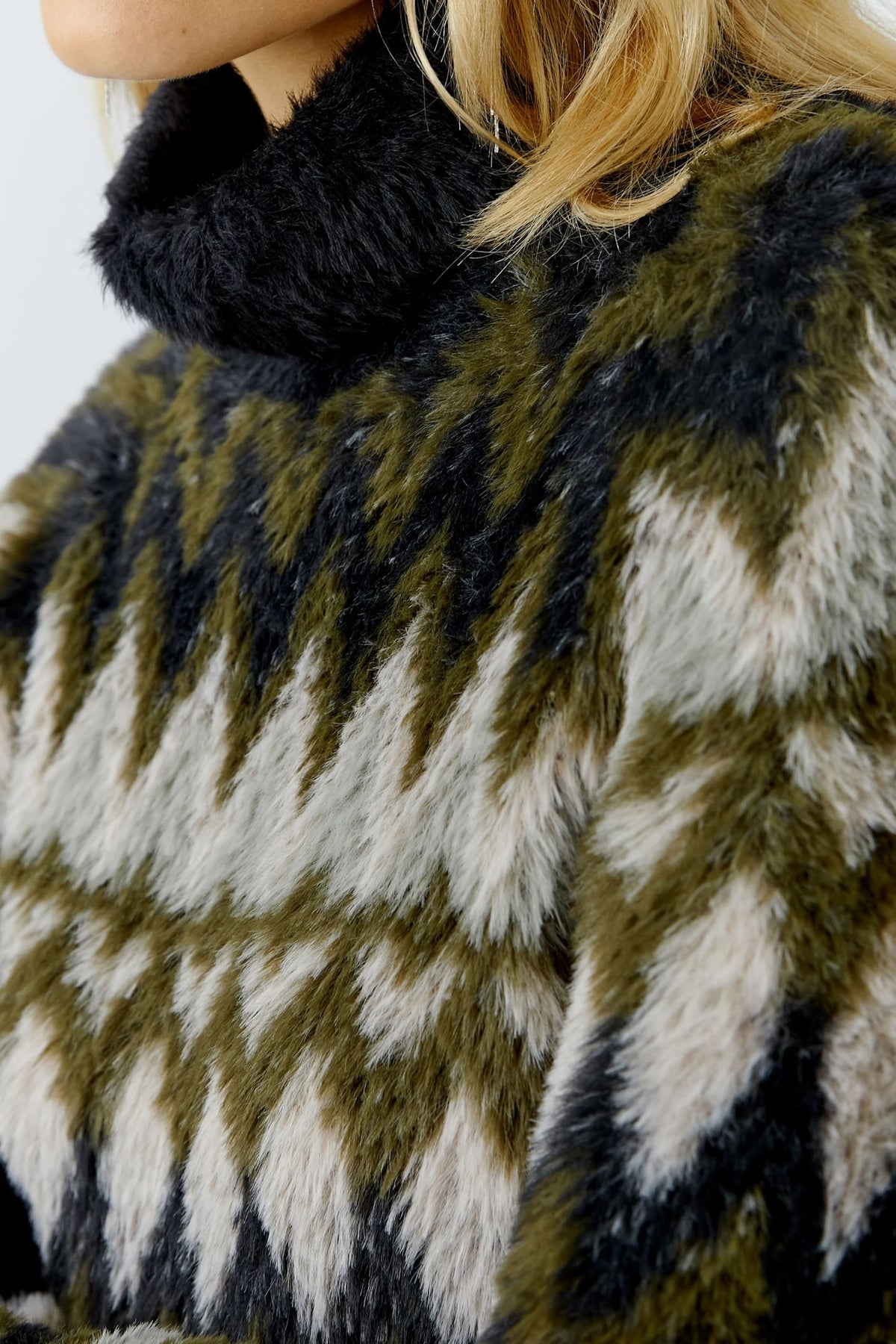 • Super fluffy "fur yarn", geometric pattern is knitted in jacquard