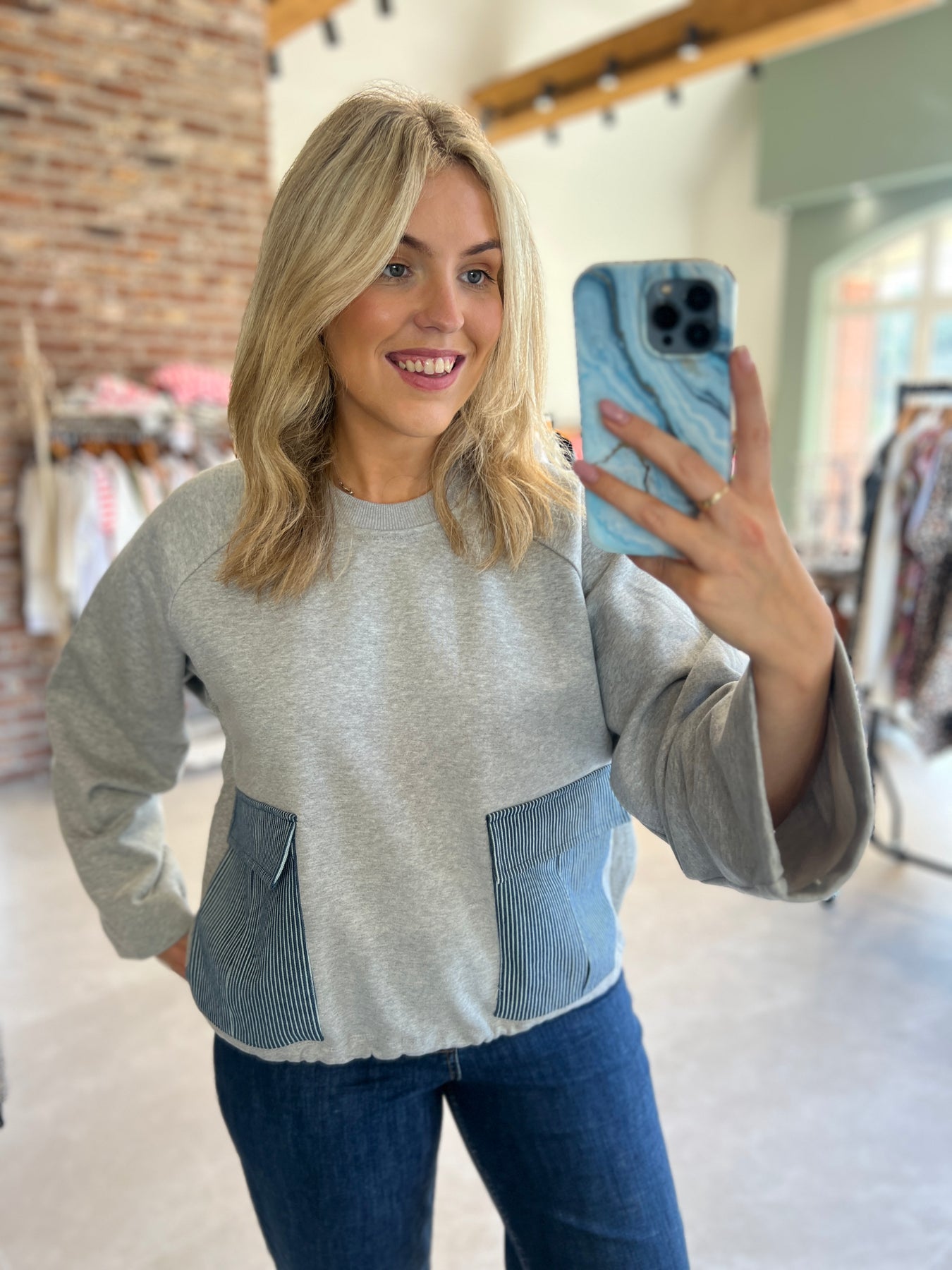 • Features: Medium grey sweatshirt, striped patch pockets, wide sleeves.