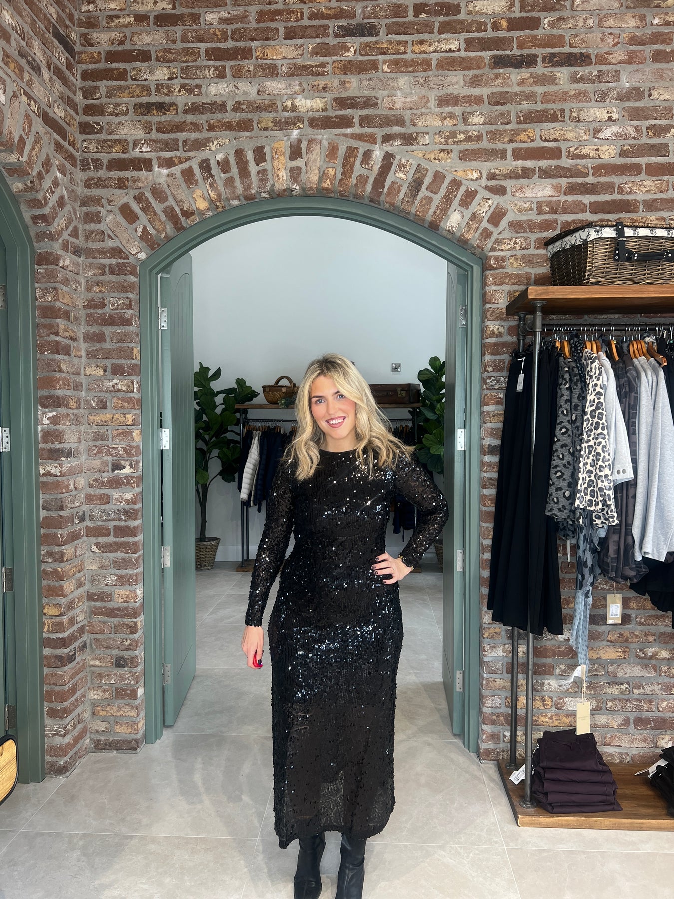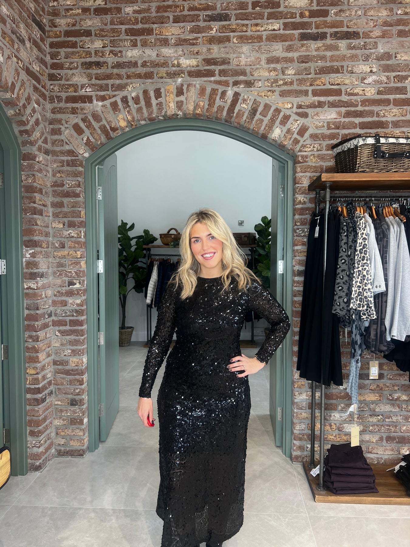 Black sparkle dress with pattern, round neckline, long dress with lining half way down.